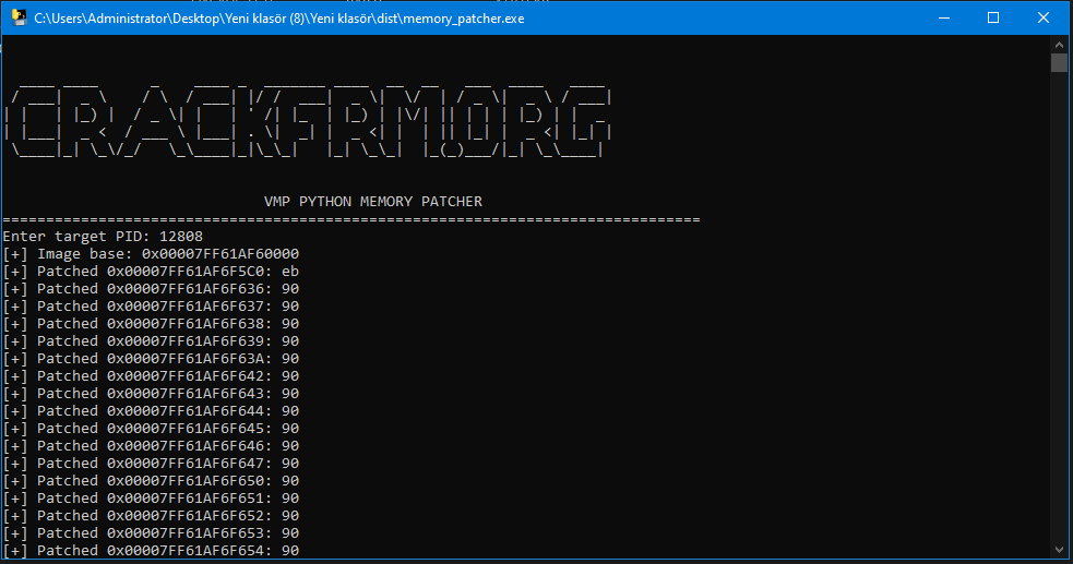What Does This Code Do? This Python code bypasses protection mechanisms of VMProtect (VMP) protected software by making runtime modifications in memory. The code directly writes to the target process's memory space, changing bytes at predetermined memory addresses. How It Works? THIS PROGRAM ALLOWS YOU TO PERFORM PATCH PROCESS WITHOUT NEEDING THE .1337 FILE Open the .py file with notepad and replace the sample patch addresses with the patch addresses you made in your target application. Process Access: Obtains the target process's PID and gains access with read and write permissions. Image Base Detection: Finds the base address where the process's main module (usually the .exe file) is loaded in memory. Memory Protection Change: Alters the protection levels of target memory regions to make them writable. Byte Patching: Changes bytes at predefined offset addresses with new values. Protection Restoration: Restores the original protection levels of the modified memory regions. link.txt1 point