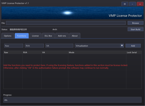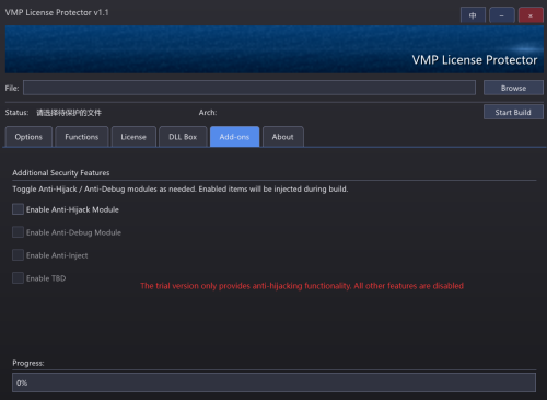 This is a recently developed recreational utility. I'm unsure which forum section is appropriate, so moderators please feel free to move it if necessary. The tool implements a combined The Enigma and VMProtect protection scheme and is designed for applying VMProtect to Win32/Win64 executables and DLLs without requiring source code. It is not compatible with .NET assemblies. The interface supports Chinese/English language switching. To function, VMProtect_Con.exe must be placed in the tool's directory. Note that the tool itself is incompatible with Windows 7 and requires the DirectX 11 runtime to be installed. Software protected with it remains compatible with Windows XP/7/10. Trial Version Limitations: Only the anti-hijacking feature is enabled. All other functions are disabled. Uses a fixed RSA key. Please do not use it to protect commercial software. While some features are disabled, the tool may be sufficient for users with modest needs if patched. The trial license expires after one month, but functionality can be extended through patching. DOWNLOAD.txt