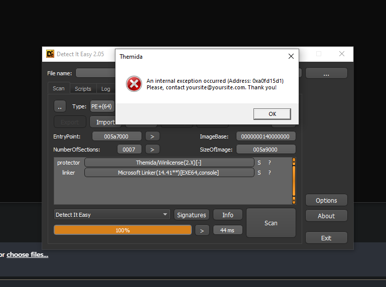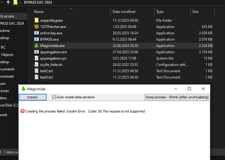 64 bit sürümü çalıştı unpackledi teşekkür ederim. patchleyebiliyorum fakat sonrasında patchli exe yi açtıgımda bu şekilde hata veriyor.