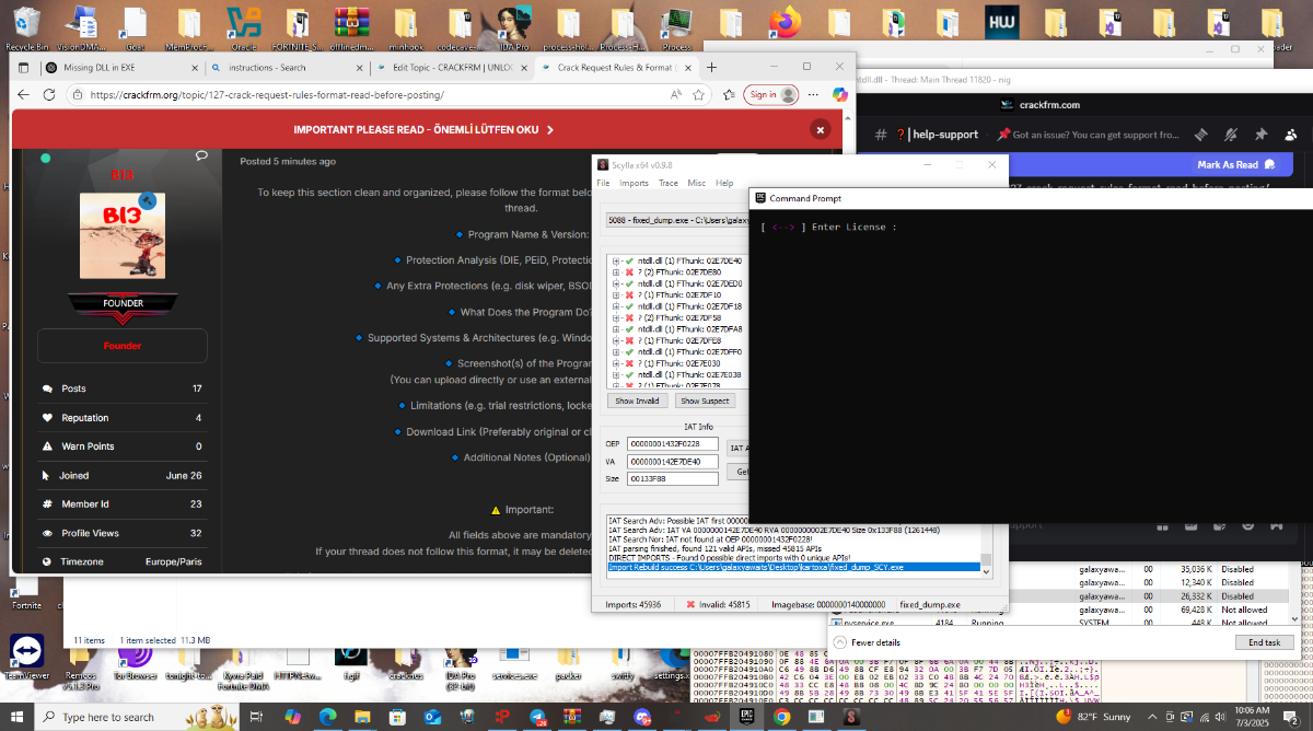 July 3, 2025Jul 3 🔹 Program Name & Version: Kartoxa FN DMA 🔹 Protection Analysis (DIE, PEiD, ProtectionID results): Enigma 5.X 🔹 Any Extra Protections (e.g. disk wiper, BSOD, VM detection): none to be known 🔹 What Does the Program Do?: It's a DMA cheat for Fortnite from a dude that scams behind peoples back. 🔹 Supported Systems & Architectures (e.g. Windows 10-11 x64 & x32): x64 🔹 Screenshot(s) of the Program: (You can upload directly or use an external image host.) 🔹 Limitations (e.g. trial restrictions, locked features): 🔹 Download Link (Preferably original or clean source): Download Link (Discord's API) 🔹 Additional Notes (Optional): Â
